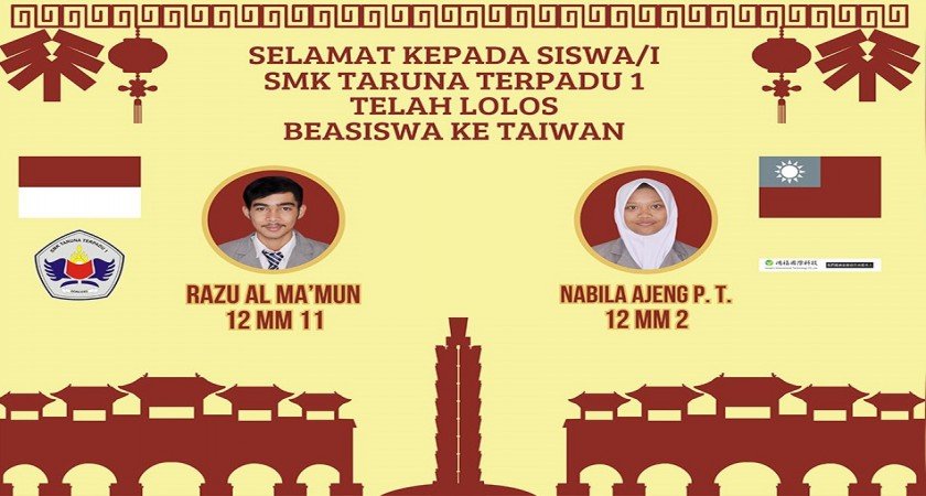Selamat kepada siswa siswi SMK Taruna Terpadu 1 yang telah lolos di perguruan tinggi luar negeri di Taiwan. Yang tertdiri dari tiga murid yaitu Razu Al Ma'mun dari kelas 12 MM 11, Aldo Rizky A. P. dari kelas 12 MM 15, dan Nabila Ajeng P. T. dari kelas 12 MM 2.