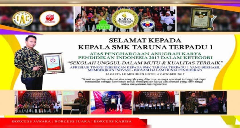 Selamat Kepada SMK Taruna Terpadu 1 mendapatkan penghargaan dalam acara ANUGRAH KARYA PENDIDIKAN INDONESIA 2017 dalam kategori " Sekolah Unggul Dalam Mutu dan Kualitas Terbaik "
