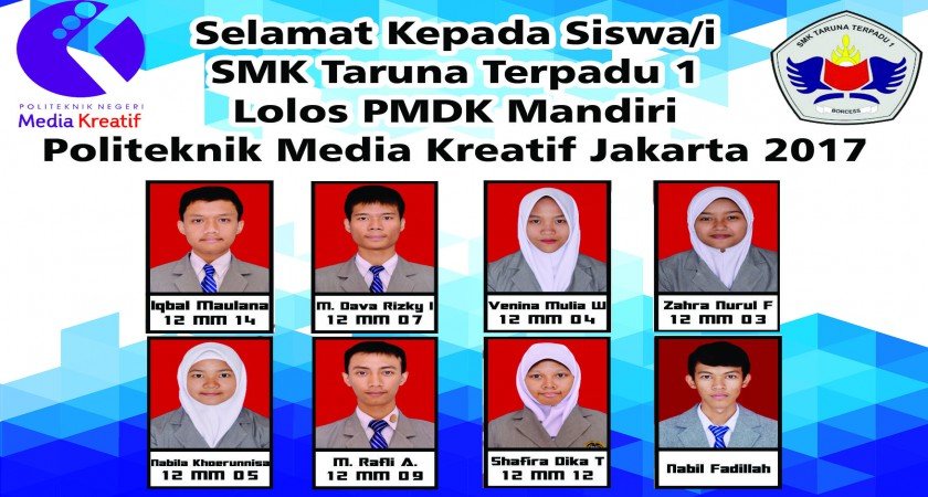 Selamat kepada nama-nama di atas yang telah lolos masuk Politeknik Negeri Media Kreatif Jakarta kalian telah membangakan SMK Taruna Terpadu 1.